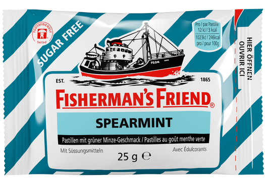 Quand mentholé n'est pas encore suffisamment mentholé pour vous, nous avons un ouragan de fraîcheur pour votre bouche : Fisherman's Friend Spearmint. Le goût spearmint est plus savoureux et plus intense. Il est rafraichissant comme une pluie battante. Sans parapluie, le matin à 6 h. En mai, en T-shirt et à pieds nus.